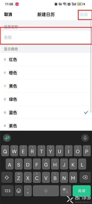 4.最后来到添加日历的页面中输入好要添加的【名称】选择好所显示出的【颜色】之后点击【完成】即可;