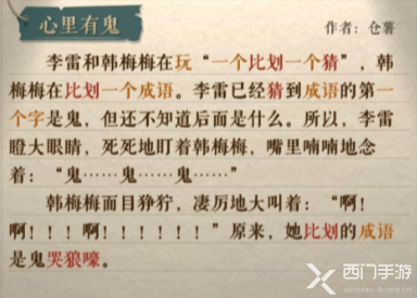 韩梅梅面目狰狞,凄厉地大叫着:“啊!啊!!!啊!!!”原来,她比划的成语是鬼哭狼嚎。