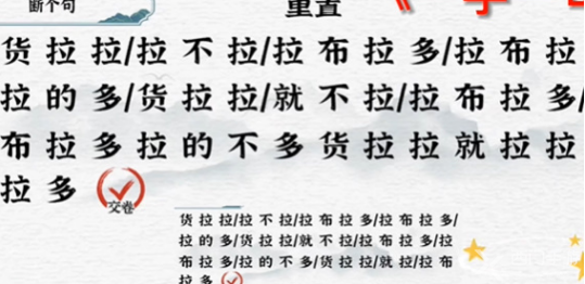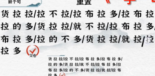 在一字一句游戏中会有各种不同的关卡,其中在断句·拉不拉中玩家可以看到有很多的拉,以及其他的文字,玩家要把这些断句变成有逻辑的话,有玩家还不知道这个关卡具体该怎么过,接下来小编为大家带来了详细介绍,希望可以帮助到大家。