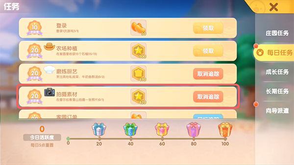 在【任务】中选择【每日任务】,找到标志了“相机”的日常任务,按照任务要求完成任务,即可获得对应的经验值,例如目前每日任务只有一个记者任务,只需要在摩尔拉雅雪山拍摄一张照片,即可获得420经验值,直接达到了当日获取上限。