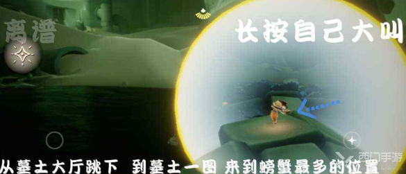 在墓土一图会有很多的螃蟹,玩家在螃蟹最多的位置,长按自己大叫即可掀翻螃蟹。