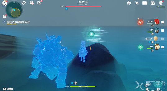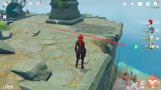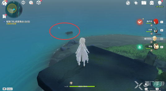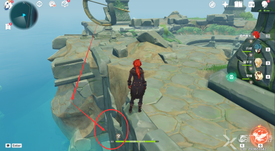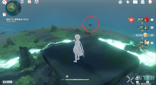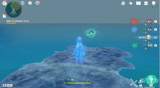 该处的风聚集点在海里,风属性的近身攻击如果触碰不到风聚集点的话,可以用冰属性攻击冻结住海面,然后靠近再进行驱散操作。