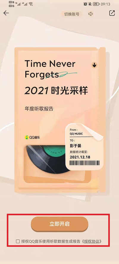 2、点击进入到年度听歌报告之中后,我们就可以开始我们的年度报告查看,需要我们同意使用QQ音乐的数据去生成报告,然后点击【立即开启】就可以开始查看了;