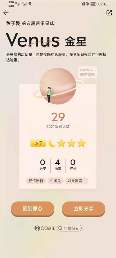 6、最后就可以获得软件给我们的平价也就是专属音乐星球,我们可以进行分享,也可以回到开始重新查看。