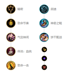 主符文选择致命节奏即可,轮子妈的攻速收益是非常高的,在里面可以很轻松的将2.5的攻速突破,更加全面的对里面的敌人造成打击,副符文可以选择启迪系里面的内容,选择启迪系则可以获得相应的更多的特殊道具效果加成。