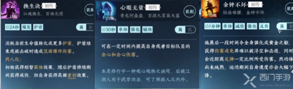 推荐理由:换生决可以消耗生命值换成互动,这和血河的基本属性一直,可以将护盾最大化,心眼无量和金钟不坏则是一个提升伤害一个获得伤害减免,这对于战士来说是必备的。