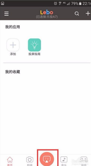 3.在手机上的乐播投屏打开后,点击下方正中间的“TV”,会出来连接选项;