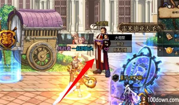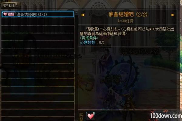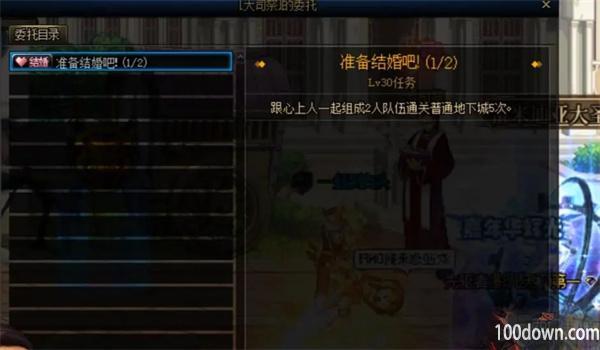 3、当对方同意订婚后,再次点击大祭司点击任务选项,第一个任务是需要和订婚对象组队挑战地下城5次,随便找个地图刷5次就可以;
