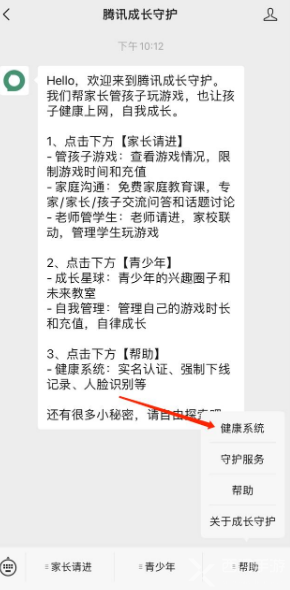 3、进入公众号/小程序之后,在聊天界面右下角有一个【帮助】,点击选择【健康系统】;