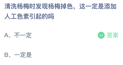 清洗杨梅时发现杨梅掉色,这一定是添加人工色素引起的吗?这是今日的蚂蚁庄园小课堂的问题,很多玩家都比较关注这个话题,接下来就让小编为大家详细介绍一下,希望可以帮助到大家。