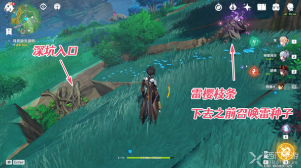 4、进入之后,深坑内有一个若雷屏障需要解除,需要携带雷种子,建议在下去以前直接在深坑旁边的雷樱枝条处召唤雷种子;