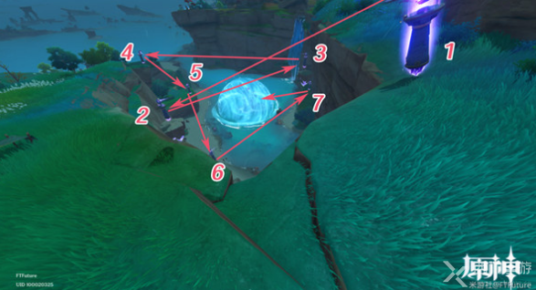 起点1即为「御引磐座」,2~7为「雷承之鉴」,按照图中标注将前一个调整至正确指向后一个即可;