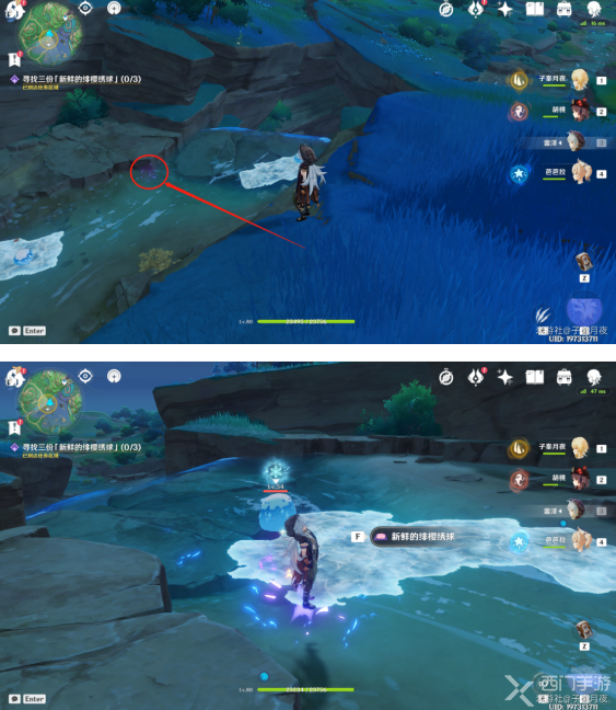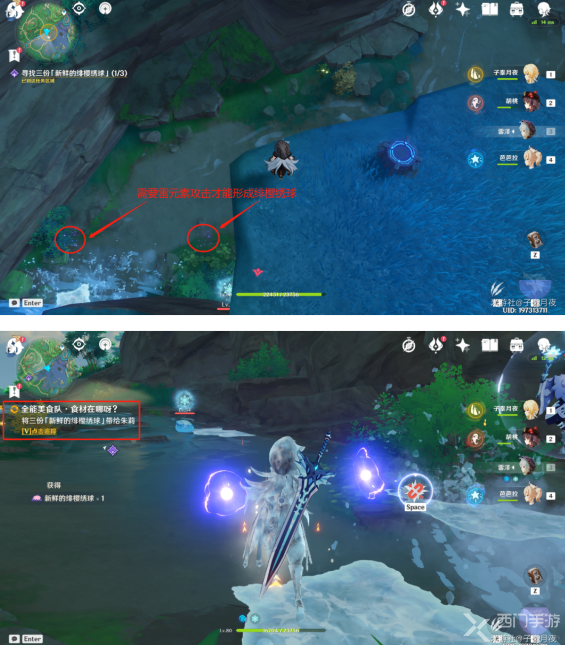 第一份所在位置:瀑布上方的水流中,使用雷元素(例如丽莎)击打那团紫雾即可变成绯樱绣球;