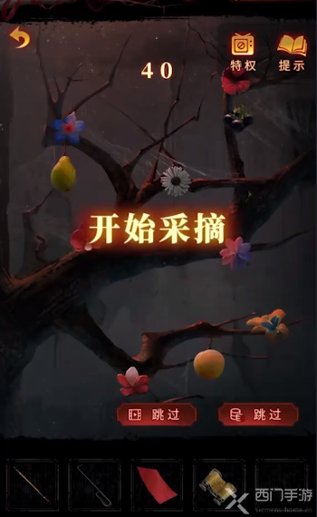 24、按照:硬壳水果→瓜果→辛辣之物→黄汁水果→浆果的顺序来点击即可完成小游戏,拾取水果后再拾取树上的剪刀;