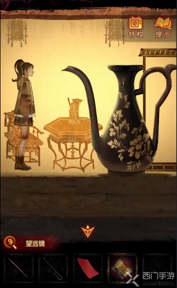 21、后面小小戏台的幕布拉开后,用望远镜放大拾取桌上的酒壶;