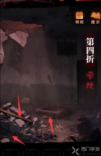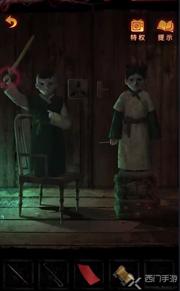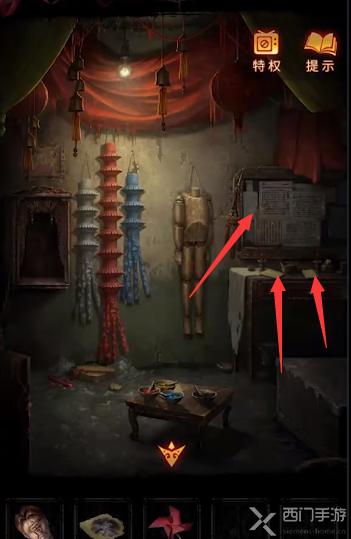 3、在下方墙洞处观察屋内各种颜色的灵幡,铺上木板之后,将碎石块砸向神龛的葬老六,可以获取钥匙;