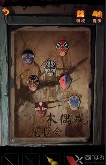 16、回到树上将脸谱摆放成下图这个样子,然后点击右边的红色戏台处用铁钩子勾出牌位;
