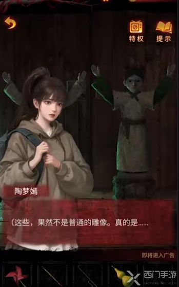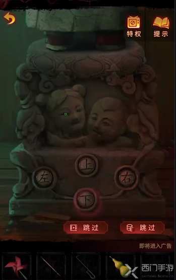 14、之后点击右侧阴童子下方的解谜,顺序为:上下上下(可以跳过),之后将风车交给女童子得到红纸;