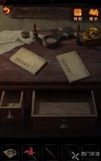 24、进入屋内点击右侧桌子上的书,照着图纸用剪刀将红纸剪成一座纸桥,将水果的汁水挤在黑色颜料里得到稀释的黑颜料;