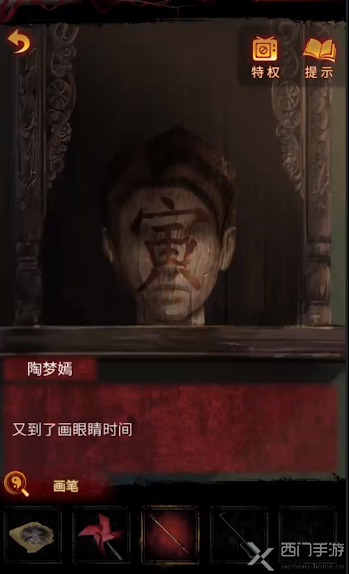 8、将木偶头放入左侧神龛中,然后用画笔准备给木偶头画眼睛,突然会伸出手把画笔抢走;