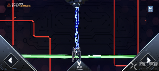 6、这一次不可以直接点击发射,需要先点击右下角的移动键,把那个钩子往右移一点,只要不碰到红线即可,移好之后点击发射即可拆除第二个炸弹;