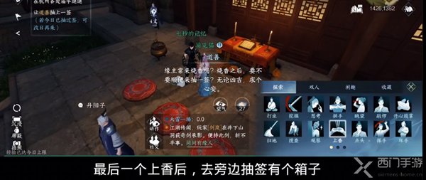 五:最后一个地点上完香后,往左走会看到道善,与其对话,抽取一之签,即可获得宝箱。
