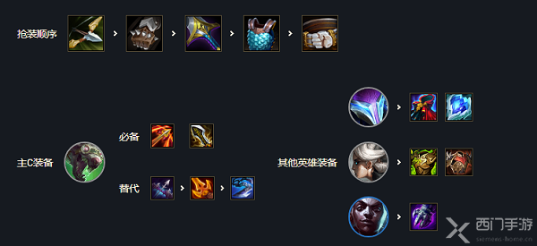 解析:男刀的无尽和火炮都是必备装,能满足伤害输出与容错率的要求。第三件看情况,出正义可以增加暴击几率,出科技枪回复更强,出水银可增加容错。艾克一般出鬼书和冰心之后捡垃圾。主T女坦要放在后排沉底,也可以做冰心、板甲、狂徒之类的捡垃圾。