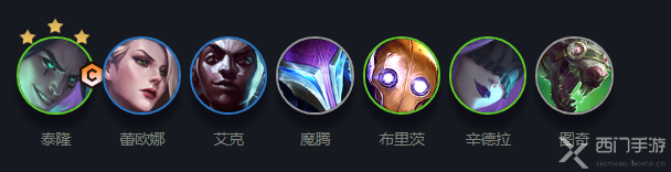 1、阵容成员:泰隆+蕾欧娜+艾克+魔腾+布里茨+辛德拉+图奇
