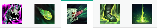 被动:克格莫获得15%/20%/25%/30%/35%额外攻击速度。 主动:克格莫抛射出一团腐蚀性的唾沫,对命中的第一个敌人造成90/140/190/240/290(+70%*AP)魔法伤害,并击碎目标20%/22%/24%/26%/28%护甲和魔法抗性,持续4秒。