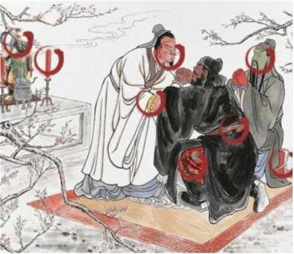 八处不和谐:桌上的关公像、烛台上的火腿肠,关羽的绿脸、张飞的保暖裤、张飞的皮带、关羽的人字拖,刘备的金镯子、刘备的歪嘴笑。