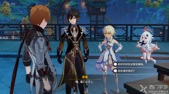 2、跟着任务追踪前往玩具摊,找摊主阿山婆购买风筝(对话中派蒙倒是直接接上了阿山婆的话,在剧情中钟离取货的时候发现没带钱,公子及时出现解救,但是被怀疑在跟踪);