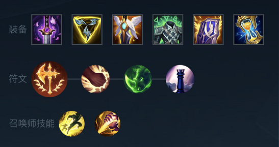 出装是死的人是活的。所有的出装都是基于对面阵容来考虑,像ap较多的阵容就可以尽早做一个小饮魔刀,收益会非常可观。在需要先手开团的情况下可以做出复活甲和金身,这样在踢回敌人之后也能确保自身还有能力继续战斗。敌方英雄恢复技能较多的话可以先出一个死刑宣告,后期可以转成大破甲。