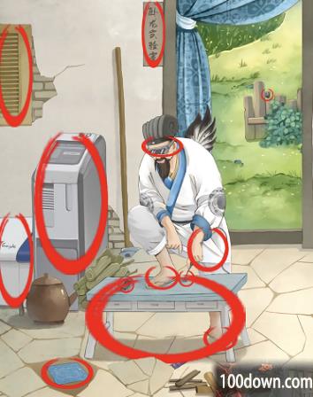 1、图中门口挂着【木牌】,外卖有【摄像机】,墙上是【通风口】,孔明戴着【护目镜】;
