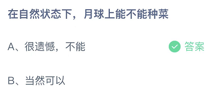在自然状态下,月球上能不能种菜?这是今日的蚂蚁庄园小课堂的问题,很多玩家都比较关注这个话题,接下来就让小编为大家详细介绍一下,希望可以帮助到大家。