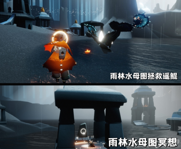 今天的冥想位置是在雨林水母图中间四连亭左边的小亭子下,玩家在石碑前光圈处打坐并留言。