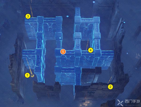 3、进入迷宫后触发1-4号的水元素方碑,触发后就可以打开5号位置的天窗从而成功通过迷宫;