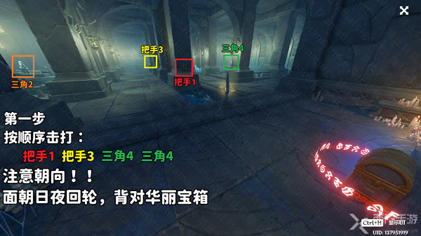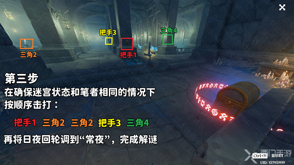 8、然后再按照顺序击打把手1、三角2、三角2、把手3、三角4,将日月轮回机关调整至常夜状态,这样就可以完成解密了;