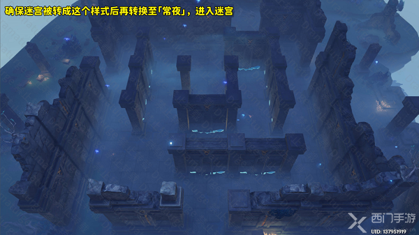 2、如果玩家已经转动过迷宫了,那么确保迷宫的状态和下图一样,这个状态后就可以调整为常夜进入迷宫了;