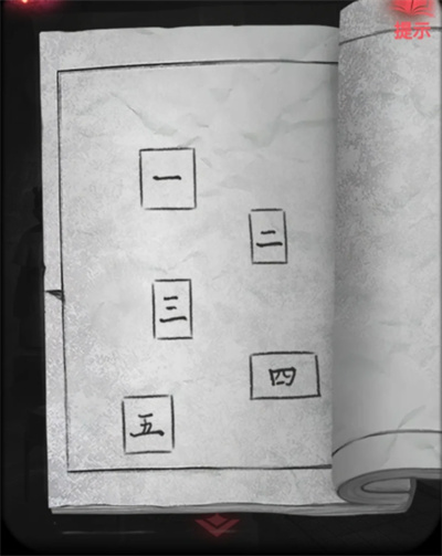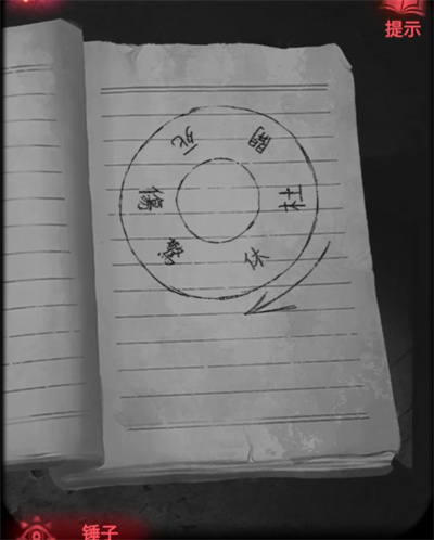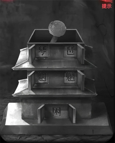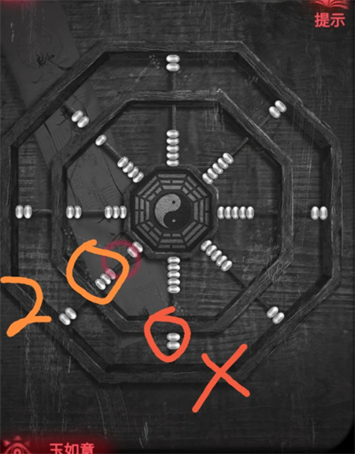 3.如图5,得到玉如意,将指针放入罗盘,再放入磁人,根据图4和石碑上的提示。得到顺序为伤死開杜休驚,得到宝石将宝石放入壁画凹槽,将小面具放在台子上,阴宅模型里用指针;将小人刺穿,得到小面具;