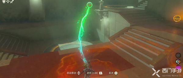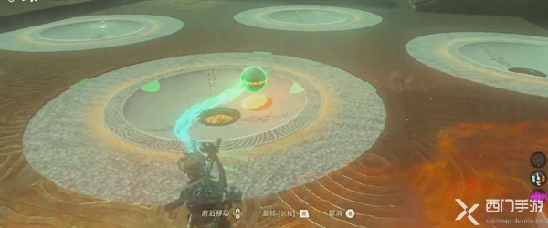 第一步:进入神庙后可以看到左右各有两个石球,先来到右侧,将一个石球放到右侧的机关处。