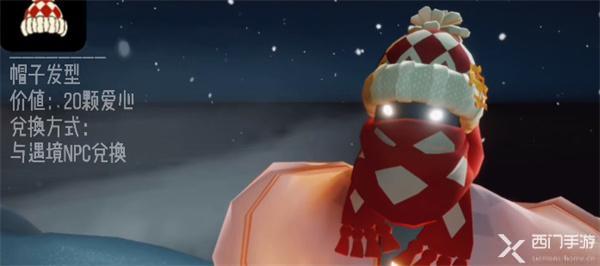 2、冬季帽:第二件新款冬季帽需要20颗爱心,在遇境和NPC进行兑换,红白相问的菱形编织手法,头顶有一个毛球;