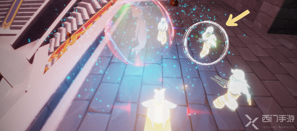 通过遇境向导的传送功能传送到该季节所在位置,向导先祖左侧第二个就是警觉旷工先祖。