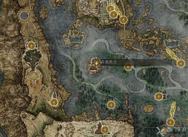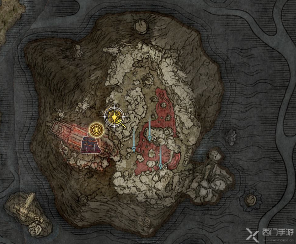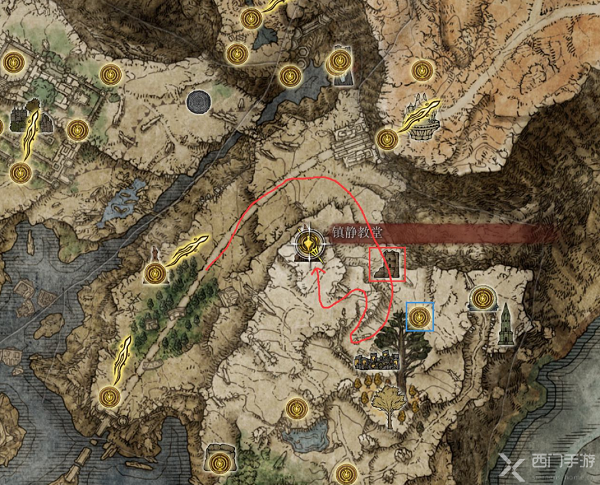 准备足够的圣杯瓶(血药),一路前进到下图红色方框塔,上塔顶端把小怪都清理完(若是已经清理则跳过),可以先开蓝色方框的赐福恢复一下,继续前进遇到红灵骑士维克入侵,打败后掉落指痕葡萄。接着进入镇静教堂,在赐福旁边能看到死去的巫女,靠近交互;