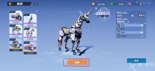 3、进入载具选择界面,在这里可以展示玩家已经获取的载具,选择想要使用的载具点击【启用】;