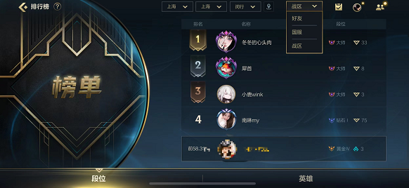 2.然后可以选择看段位排名和英雄排名,其中在段位界面的上方可以选择查看好友、国服、战区等不同的排名;