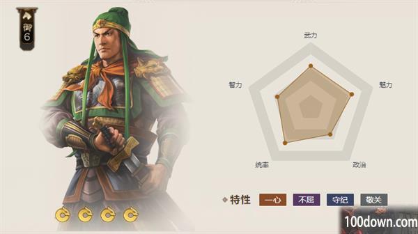 关平拥有很高的统率,武力,魅力。政治,智力发展也不错且平衡。【突击】额外对目标身后的敌军造成兵刃伤害。其全面的技能属性可以应对多种战场环境。