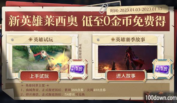 莱西奥会有两个对应的任务,就是通过英雄试玩和英雄赛季故事系统,完成之后可以得2张英雄金币五折卡