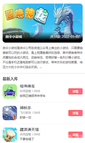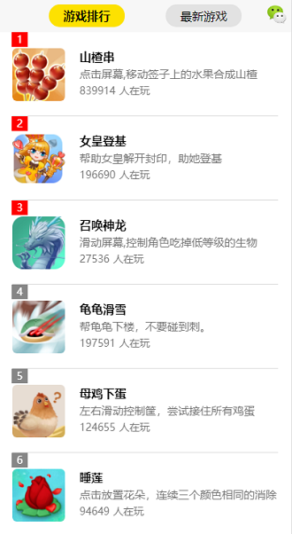 前往微伞小游戏的官网页面可以直接体验微伞小游戏,在官网界面一共有游戏排行和最新游戏两个分类,玩家可以根据相应的分类筛选自己想玩的游戏,查看游戏排行了解当前最热门的小游戏;