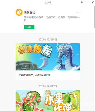 玩家可以打开自己的微信,在微信的搜索框中输入“比翼互动”搜索对应公众号,点击关注该公众号也可以在里面试玩微伞小游戏,当有全新的小游戏上线后会第一时间在公众号上面进行发布,点击文章动态就可以去体验。