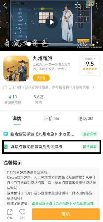 4、在详情界面可以查看近期该游戏发布的信息,找到消息中填写问卷获取首测资格活动,点击【前往填写】;